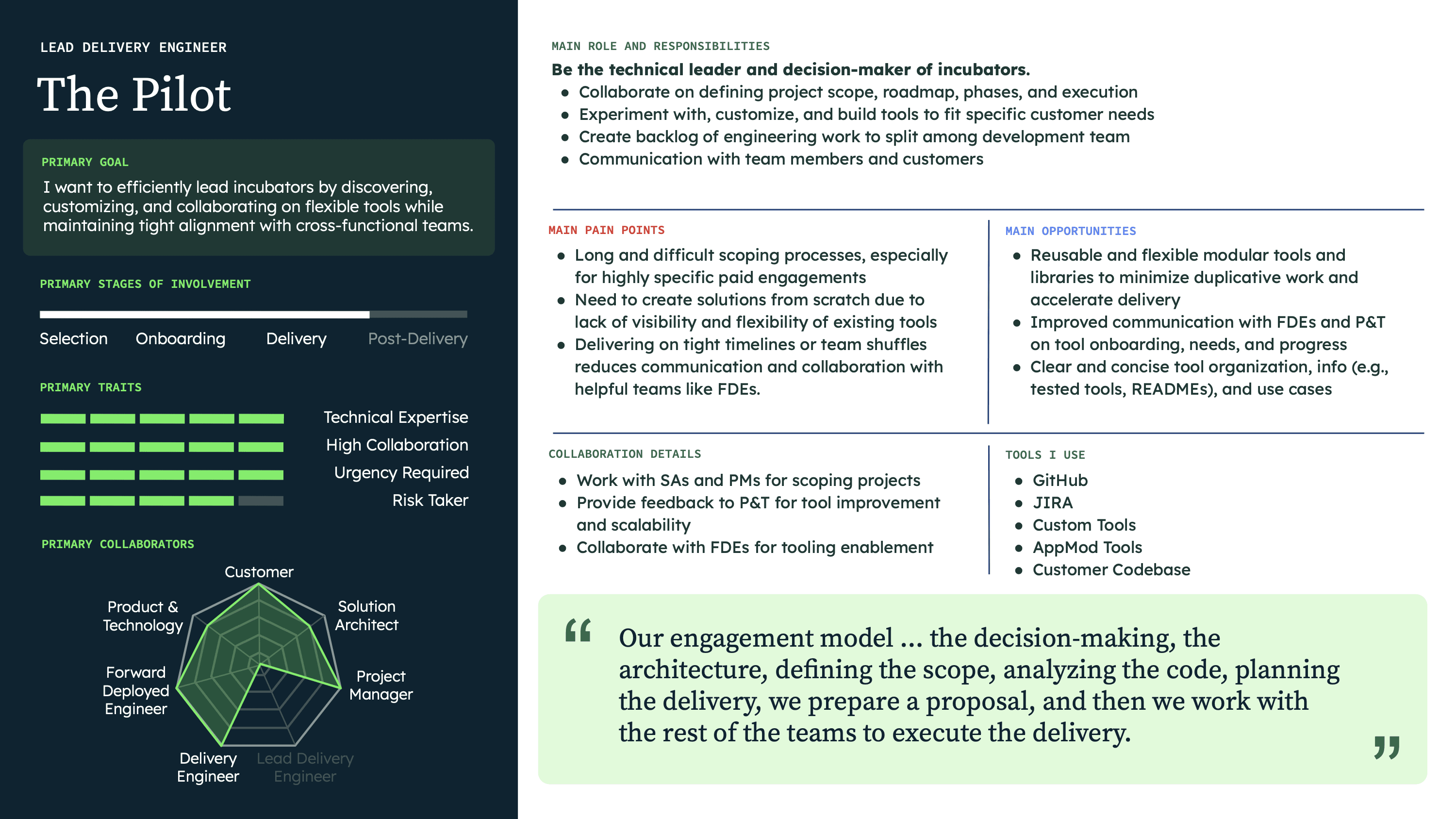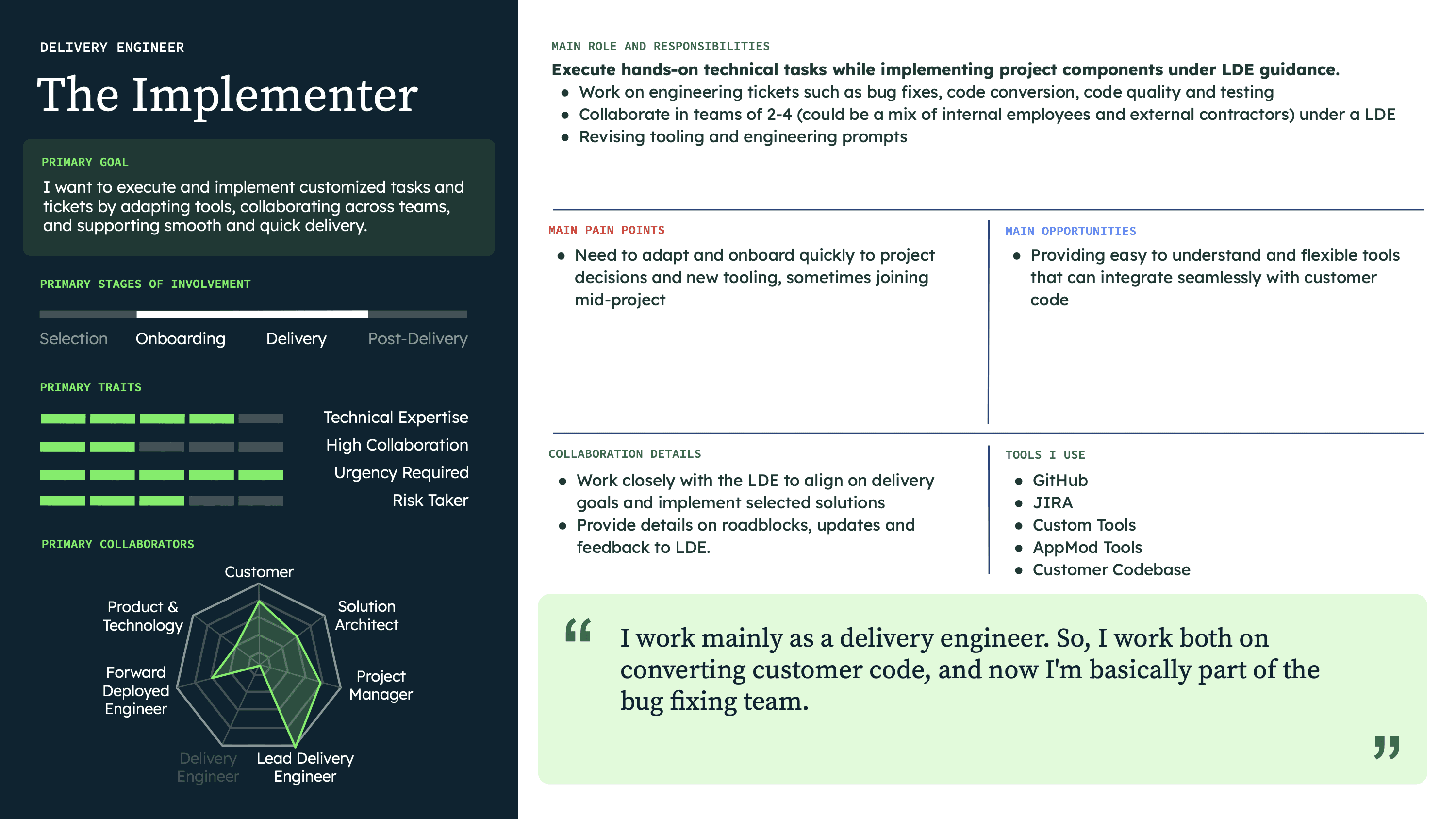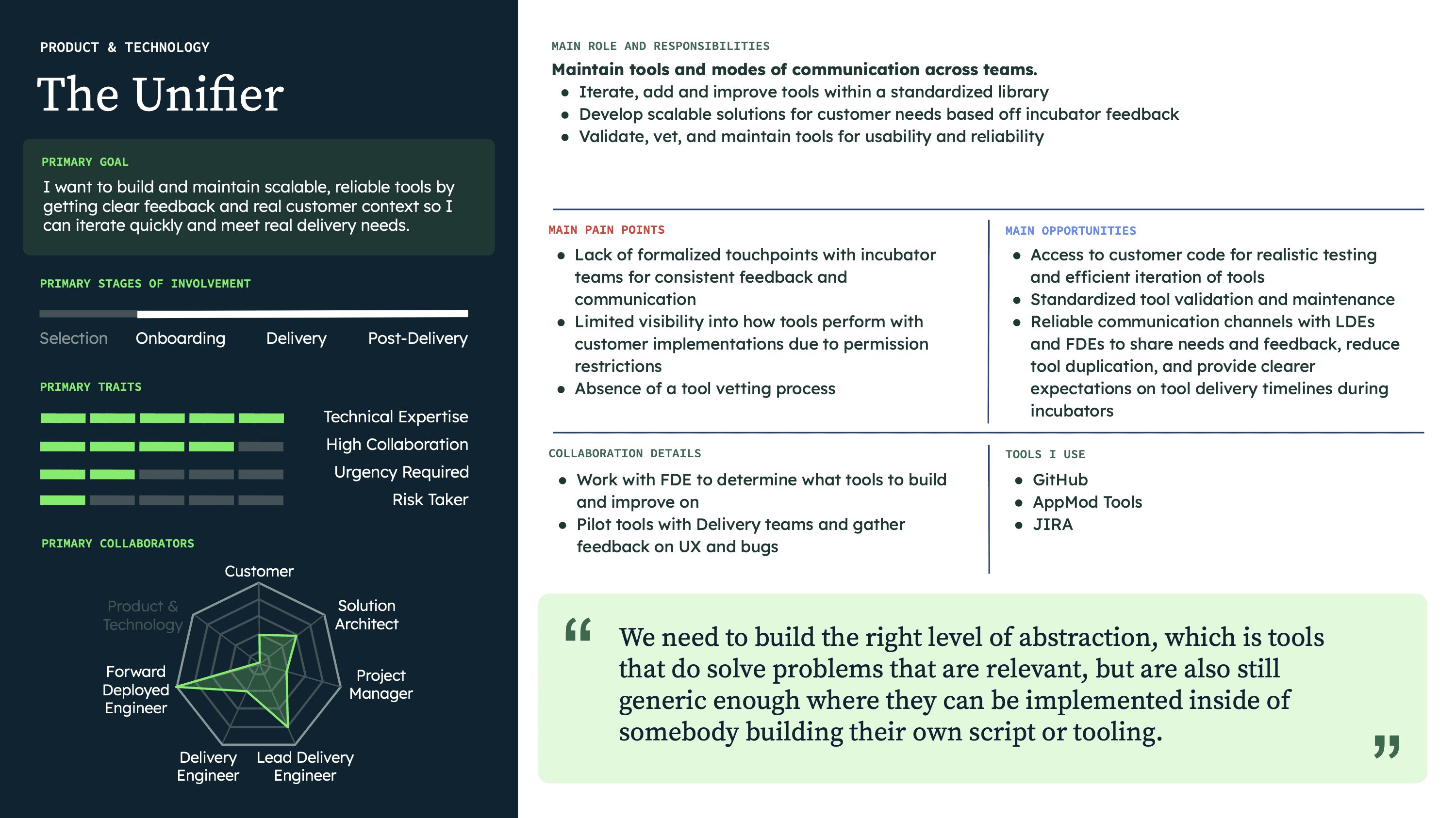 I then synthesized findings into six distinct personas that make up an app modernization team. This gave product and engineering a shared language, helping us prioritize features, design clearer handoffs, and set a more intentional foundation for the emerging modernization product.