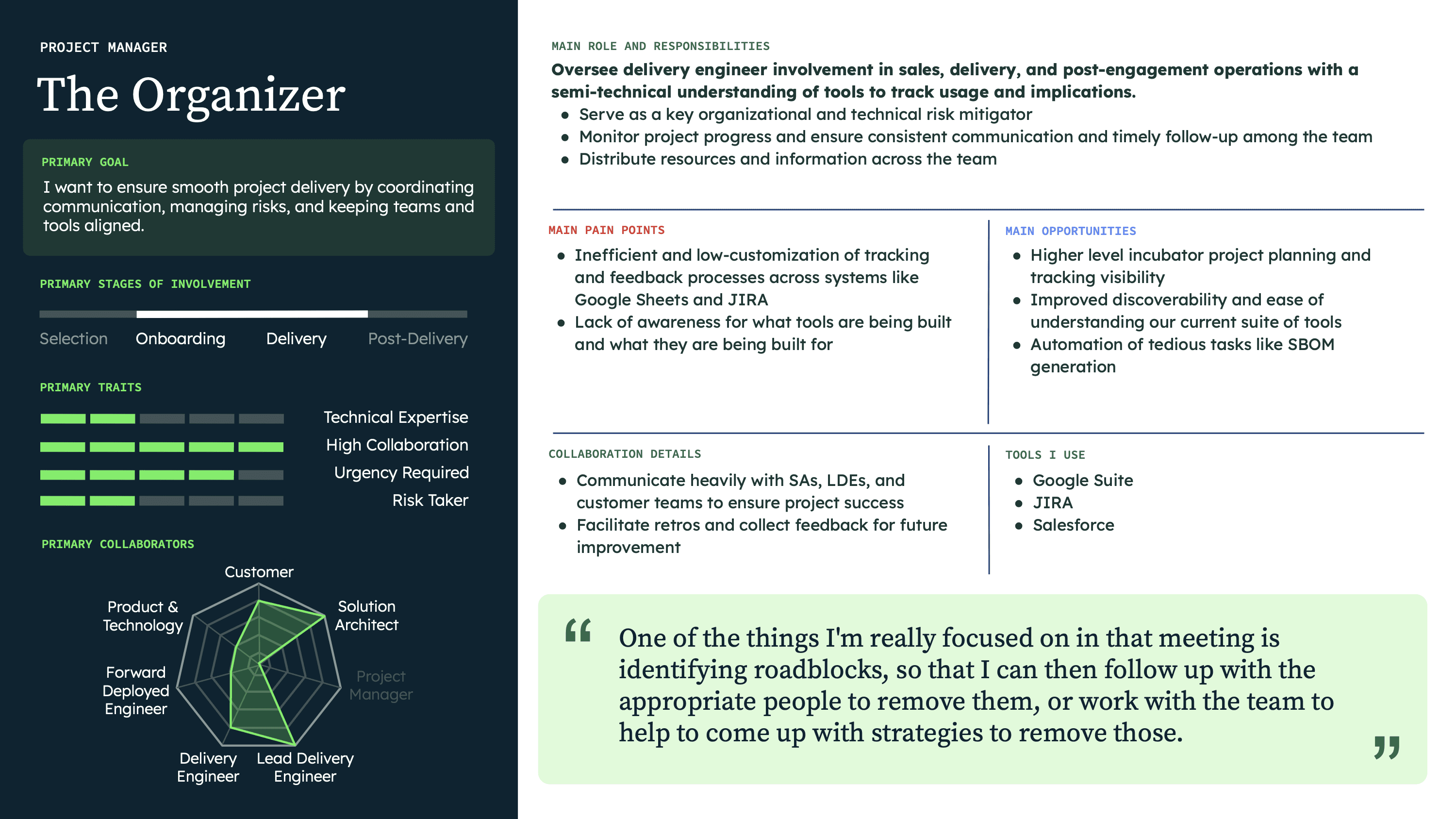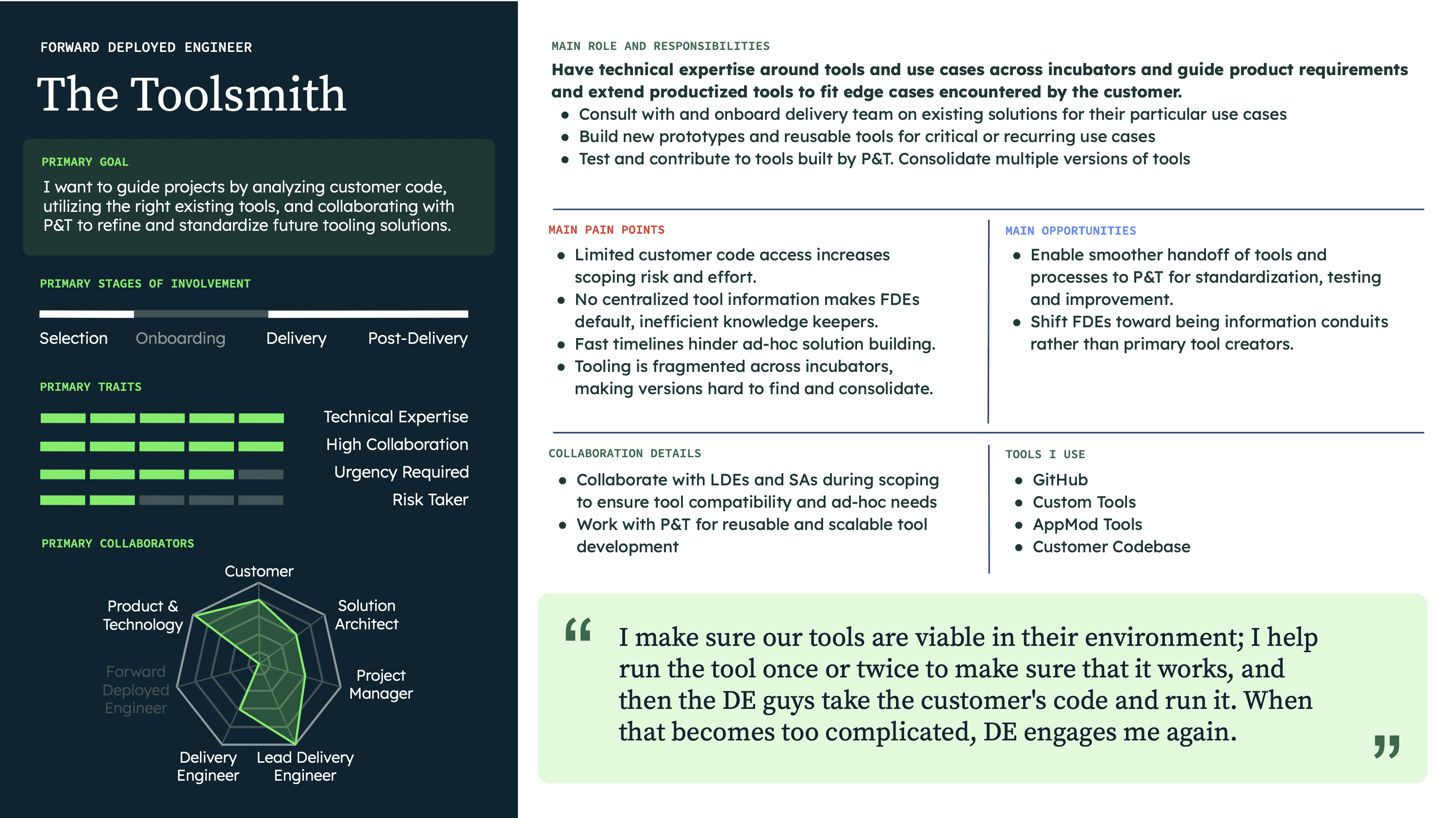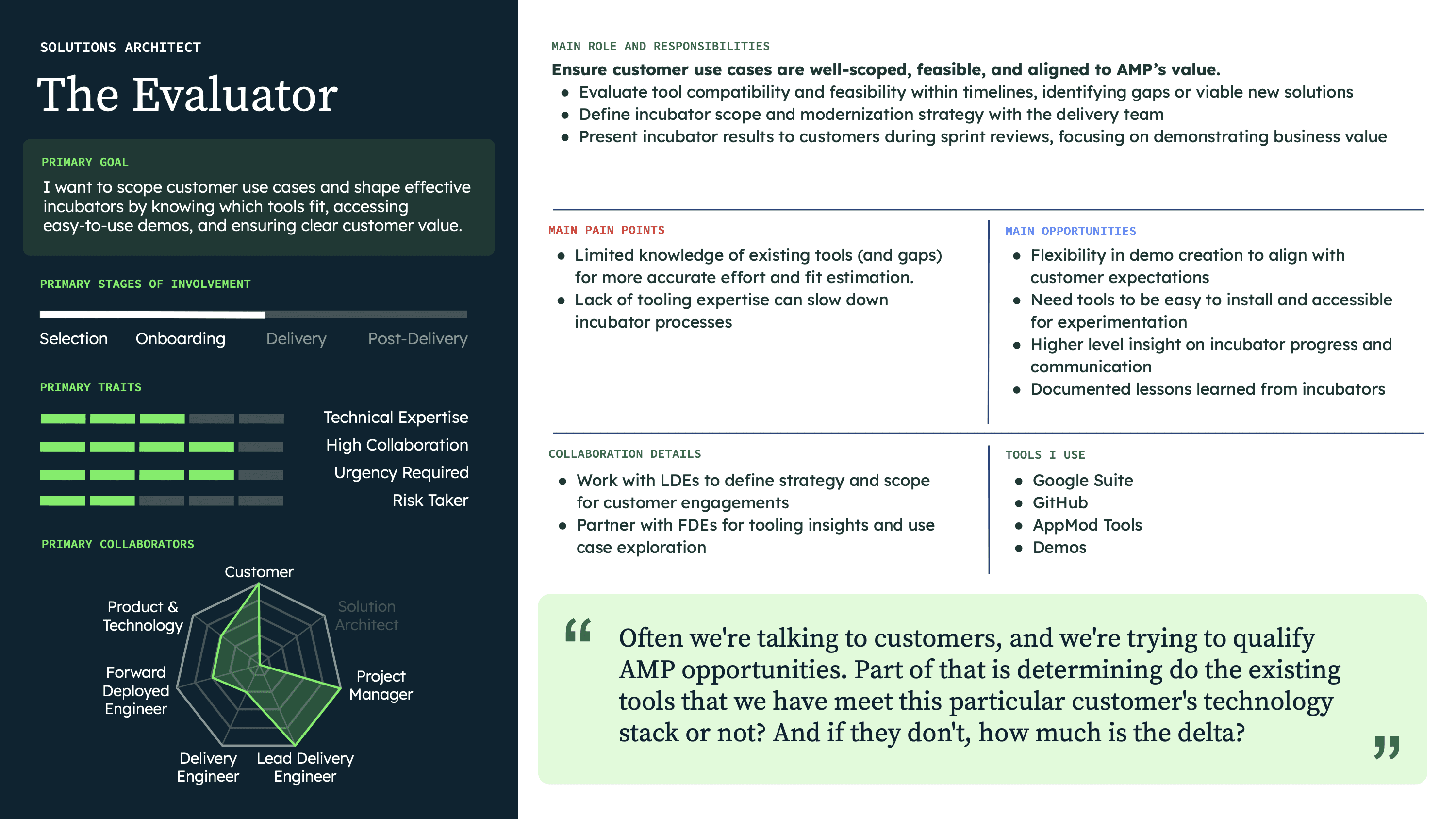 I then synthesized findings into six distinct personas that make up an app modernization team. This gave product and engineering a shared language, helping us prioritize features, design clearer handoffs, and set a more intentional foundation for the emerging modernization product.