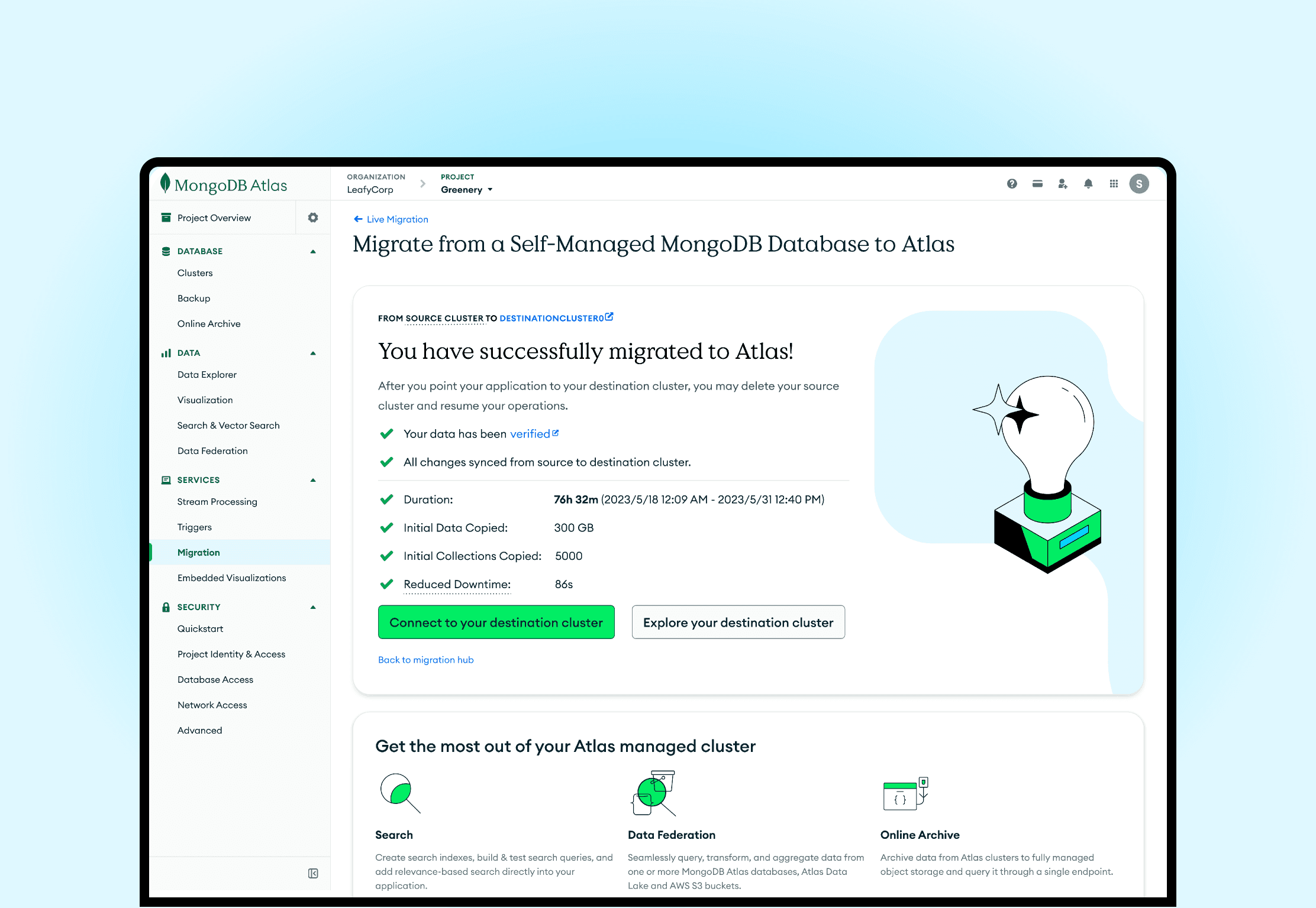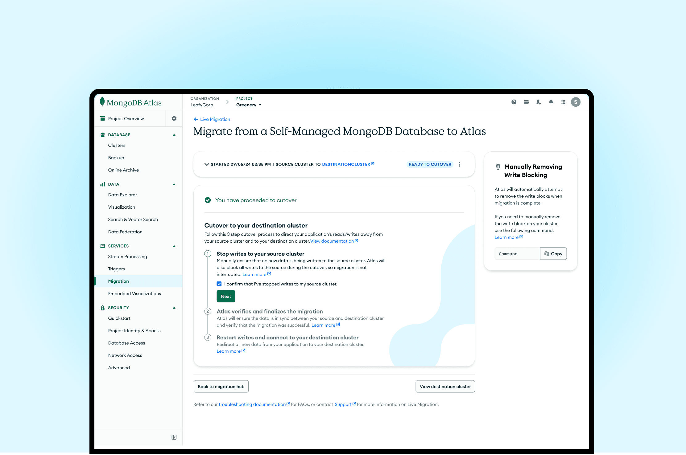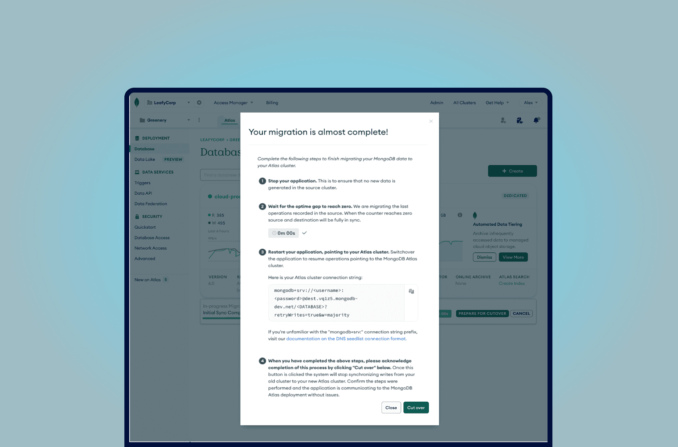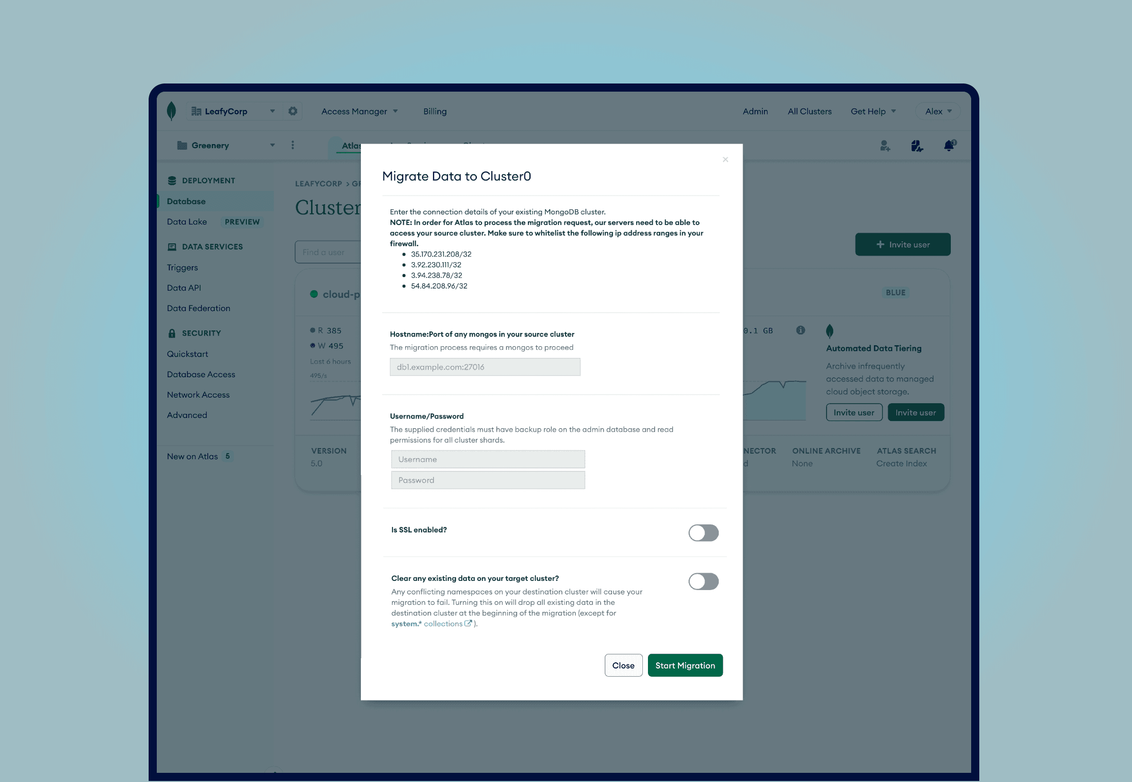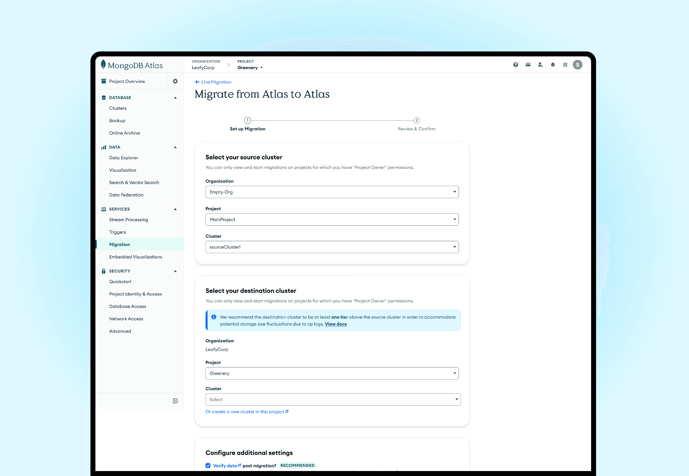 Previously, users had to constantly go hunt for source cluster information, ip addresses and user credentials. Now, set up is integrated into the migration flow - Atlas automatically identifies available clusters, provides network access and creates a temporary user for the migration. During the migration, Atlas will automatically verify the data moved.
