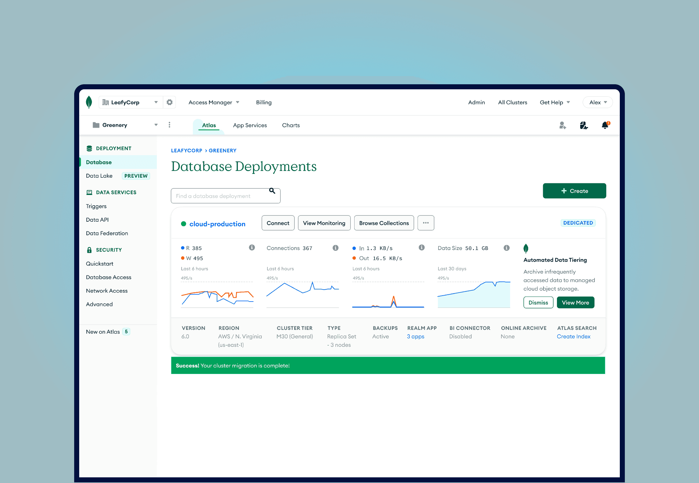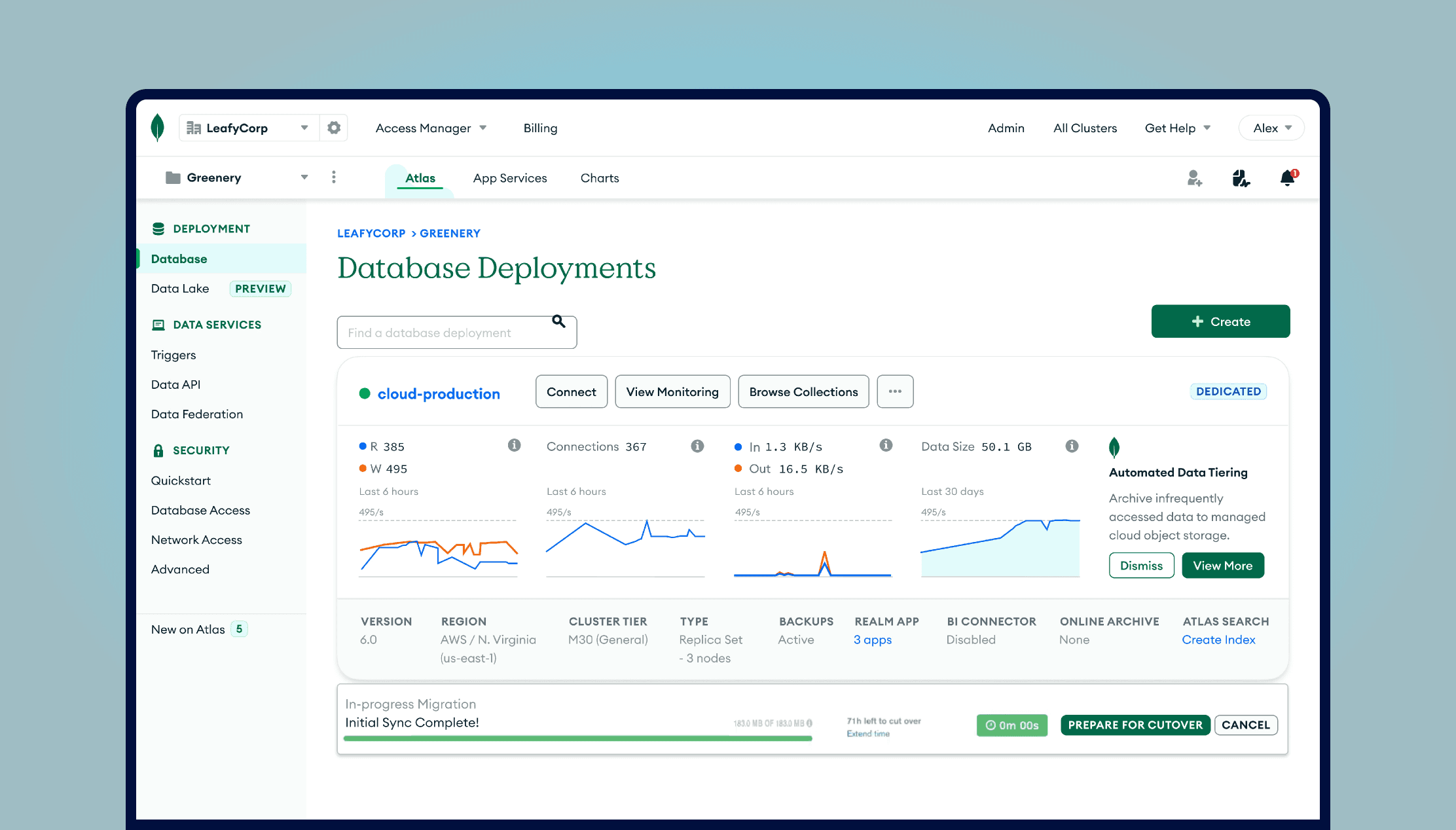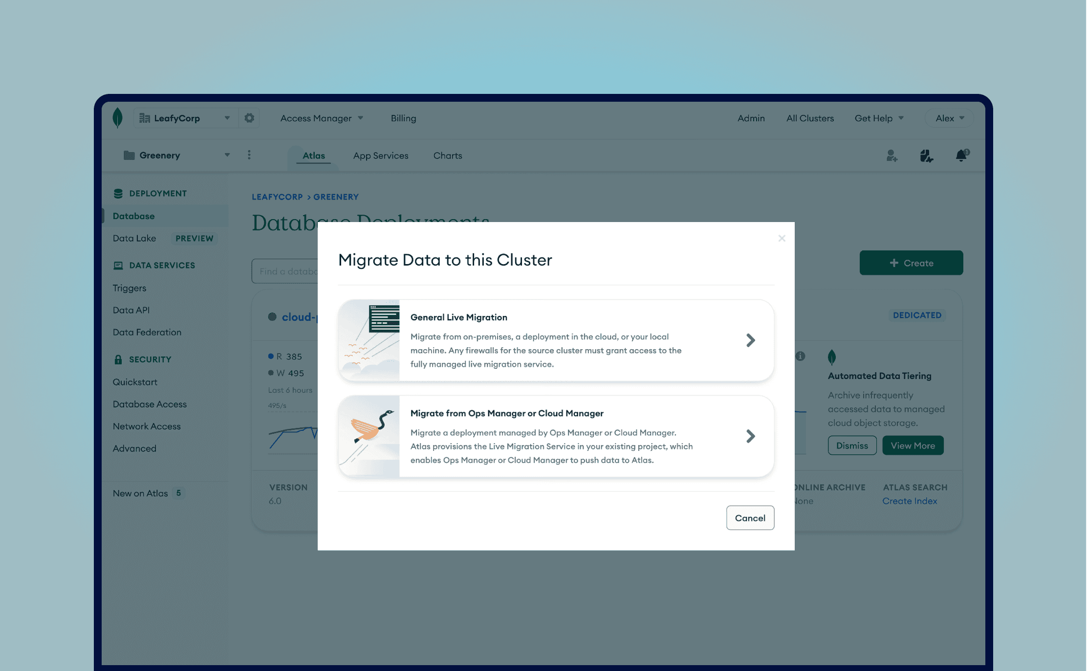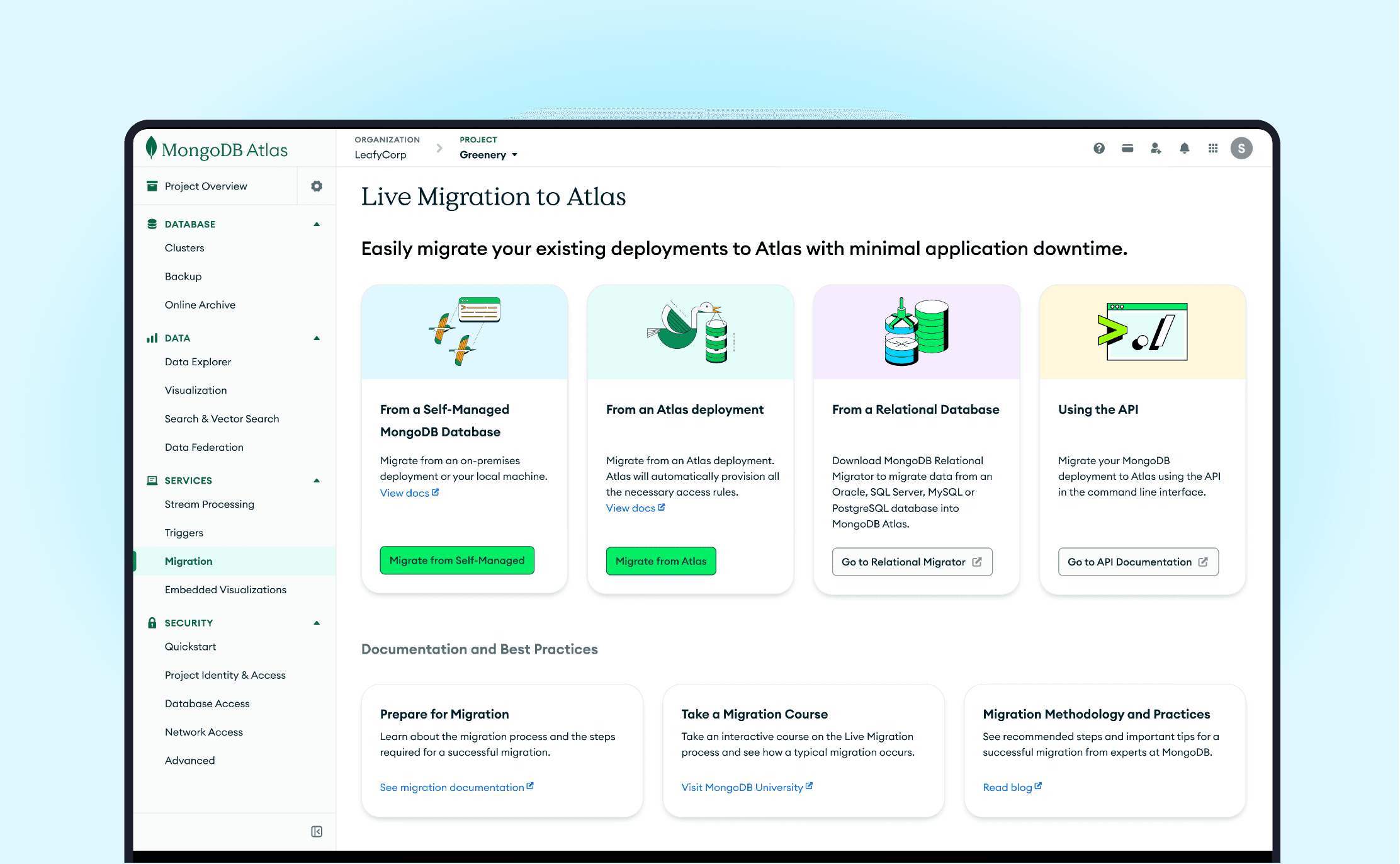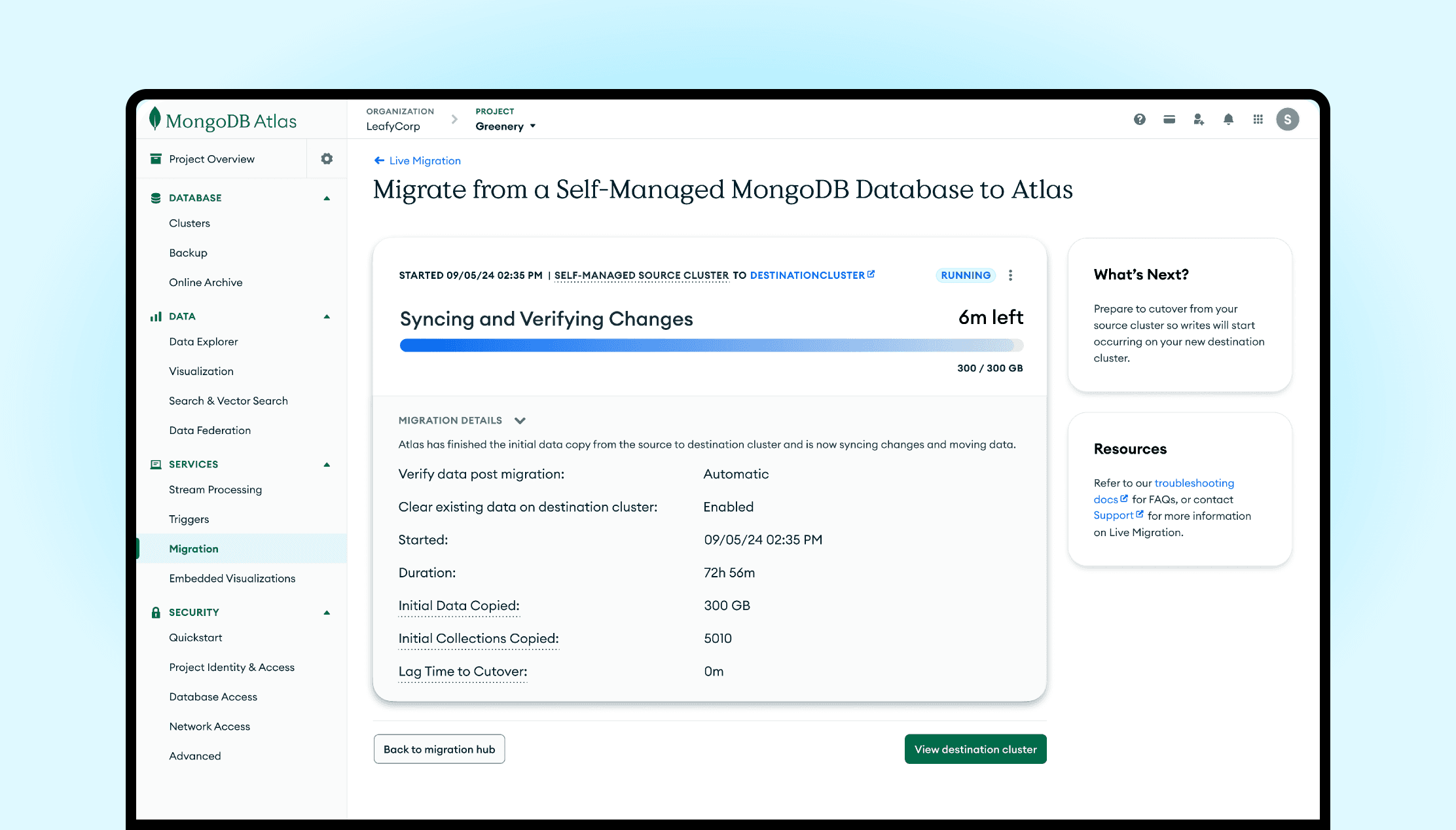 Previously, users had to constantly go hunt for source cluster information, ip addresses and user credentials. Now, set up is integrated into the migration flow - Atlas automatically identifies available clusters, provides network access and creates a temporary user for the migration. During the migration, Atlas will automatically verify the data moved.