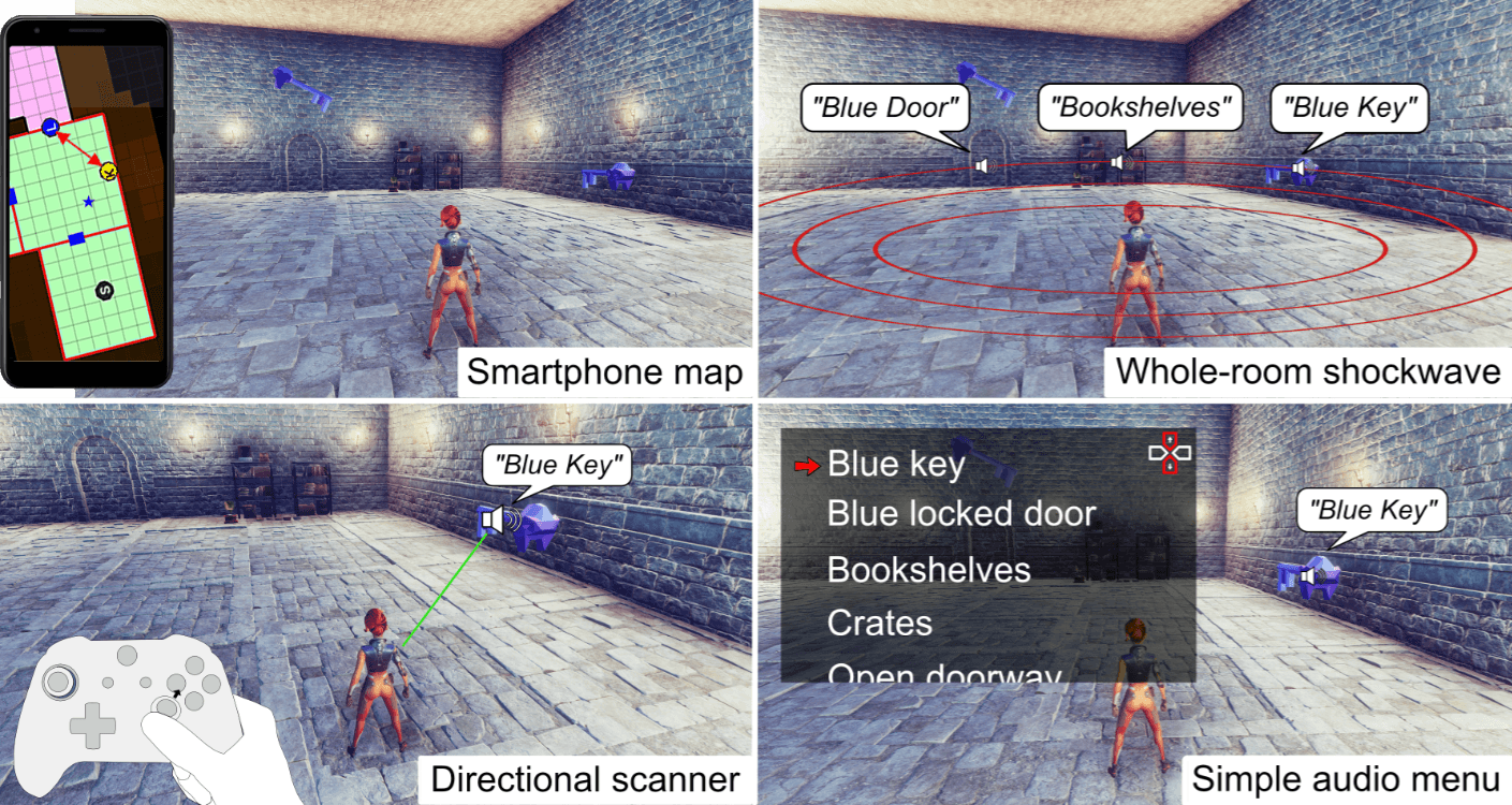 We investigated 4 approaches to giving VIPs spatial awareness of their surroundings, and built out these systems through a 3D third person adventure escape game and tested with 9 visually impaired participants: